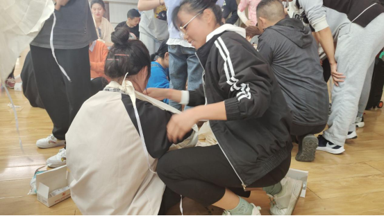 下午则是指导员用人体模型,三角巾、绷带的使用在现场做示范,随后指导学员在体育馆进行实操训练。两位指导员幽默风趣的教学气氛带动了课堂的整体气氛,同学们兴趣高涨不断的向指导员提出问题,良好的互动交流使得同学们学习印象更加深刻。