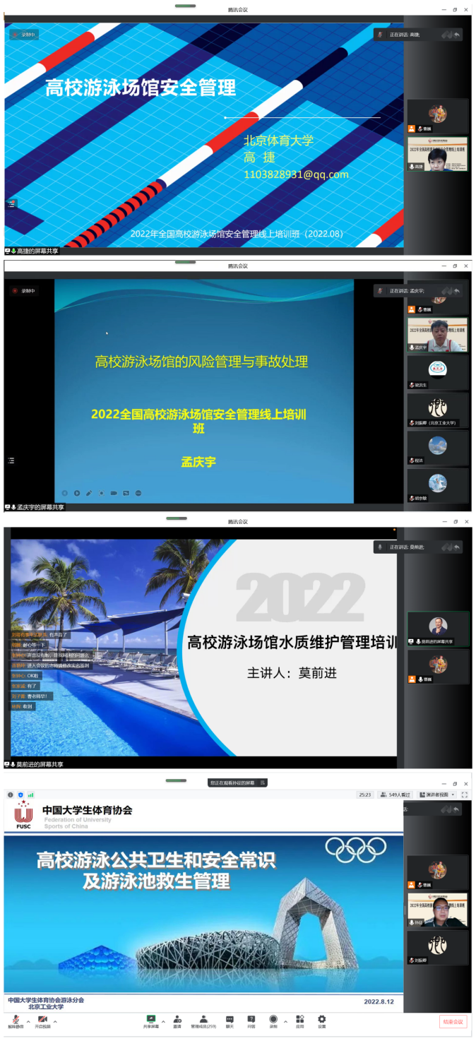 2022年全国高校游泳场馆安全管理线上培训班于8月11日正式开班,进行为期2天的培训。本次培训由中国大学生体育协会主办,共有来自全国232所高校的665名学员参加。体育学院结合我校贵安校区场馆建设要求组织相关教师(牟玥、李小可、于庆磊)参加此次培训,为游泳馆建成后管理做好保障准备工作。