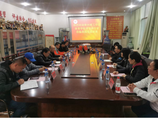 26日上午,体育学院一行首先前往贵州师范大学体育学院,交流座谈会在贵州师范大学体育学院会议室举行,贵州师范大学体育学院党委书记蒙黎明,副院长杨中兵,各科室负责人及教职工代表出席座谈会,会议由蒙黎明主持。