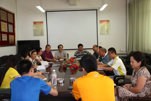 (体教部田广)2014年7月7日下午,体教部副部长高徐率体教部教师赴贵州民族大学体育学院交流学习,在体育学院党委书记许义坤、党委副书记袁鹰、院长夏五四、副院长陈强、副院长黄咏接待下进行。会议由陈强副院长主持,会上,许义坤书记致了欢迎辞,对高部长一行的到来表示热烈的欢迎;夏五四院长详细介绍了学院机构设置、教学管理、教学条件建设、少数民族传统体育教学和训练状况以及取得的成绩等。高部长对我校现状、组队情况、存在问题、面临困境进行交流。民大几位负责少数民族传统体育项目的教练毫无保留给我们介绍了成功经验,并针对我院情况提出可行性建议。