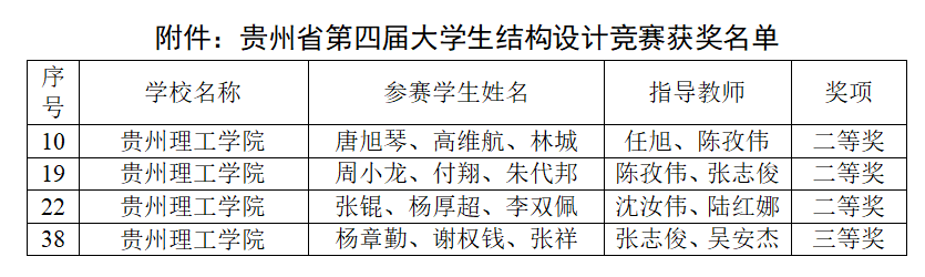 (本网讯 土木工程学院 文/韦昌翠 )近日,贵州省第四届大学生结构设计竞赛,贵州理工学院土木工程学院荣获二等奖3项、三等奖1项。