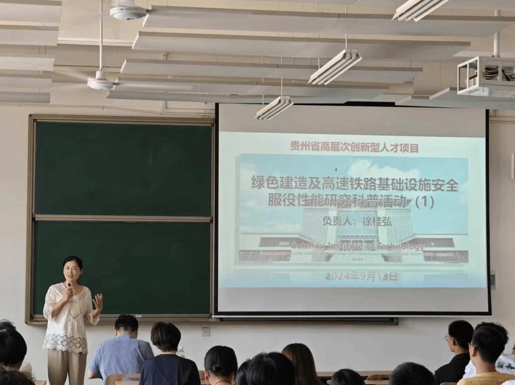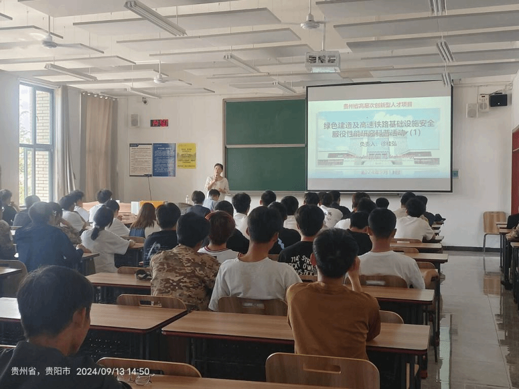 讲座尾声,徐桂弘鼓励学生们将所学知识运用到实践中,为构建更加绿色、安全、高效的基础设施贡献自己的力量,让高速铁路成为连接未来的绿色通道。讲座在热烈的掌声中结束,留下的是对未来建设事业的深刻思考与无限憧憬。此次科普活动不仅丰富了学生们的专业知识,更激发了他们对贵州发展面临的基本问题的思考、对绿色建造和基础设施安全的关注,激励着他们在未来的道路上,为我国的基础设施建设贡献自己的青春与智慧。