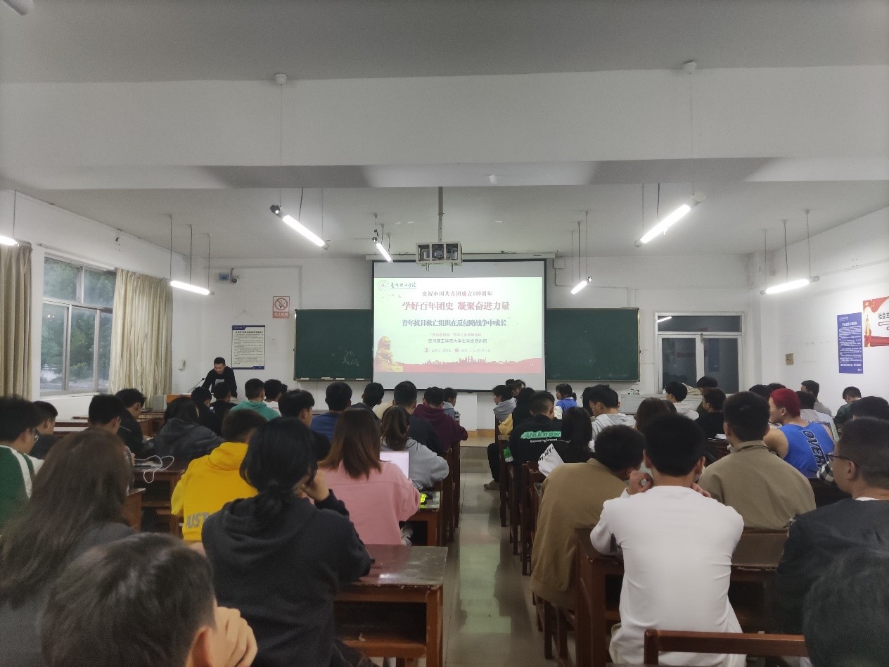 本网讯(土木工程学院 文/邢友维 图/韦昌翠)5月23日晚,青年抗日救亡组织在反侵略战争中成长团史宣讲在第三教学楼105教室开展。本次宣讲由贵州理工学院大学生党史宣讲团成员、土木工程学院学生胡京安主讲,体育学院体育201、202、203、204班全体同学参加。