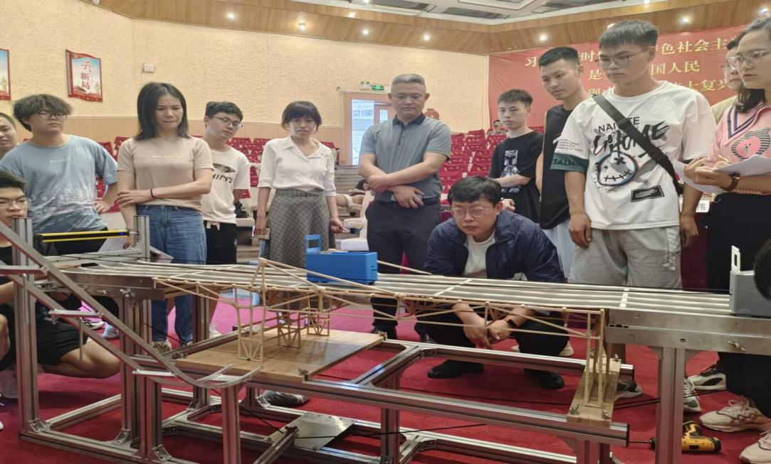 经过同学们为期一个月的不懈努力和坚持,共有34支队伍参赛。参赛队伍使用竹杆、竹片、竹皮以及502胶水进行桥梁模型制作,比赛现场对模型进行展示与加载,开展三级加载测试,分别是30N,50N以及50N与撞击同时作用。随后,评委结合各队伍模型的受力情况、声光报警器报警情况及模型损坏程度作出评分。