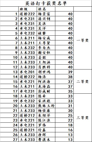 本网讯(土木工程学院 文/杜红阳 图/张毫雲)2023年10月16日-11月21日历时40天的“阳光早晨”打卡活动圆满结束。此次活动共300余人参加,其中英语打卡模块共计27名同学获奖,一等奖12名,二等奖5名,三等奖10名;运动打卡模块共计51名同学获奖,一等奖23名,二等奖10名,三等奖18名,具体获奖名单如下图: