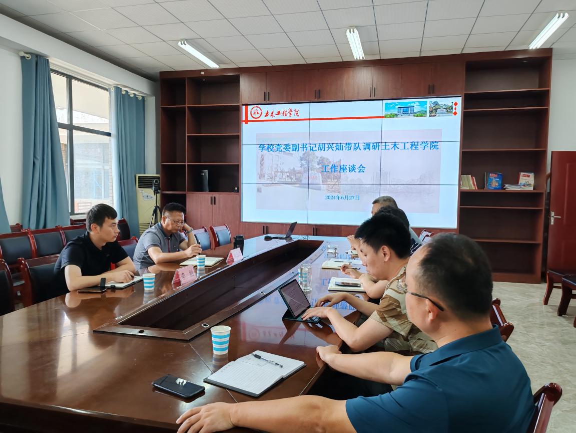 本网讯(土木工程学院 图/文 土木工程学院)2024年6月27日下午,校党委副书记胡兴灿来我院就宣传思想工作和统战工作开展调研,校党委委员、宣传部长、统战部部长李朋陪同。我院班子成员及师生党支部书记参加座谈会。