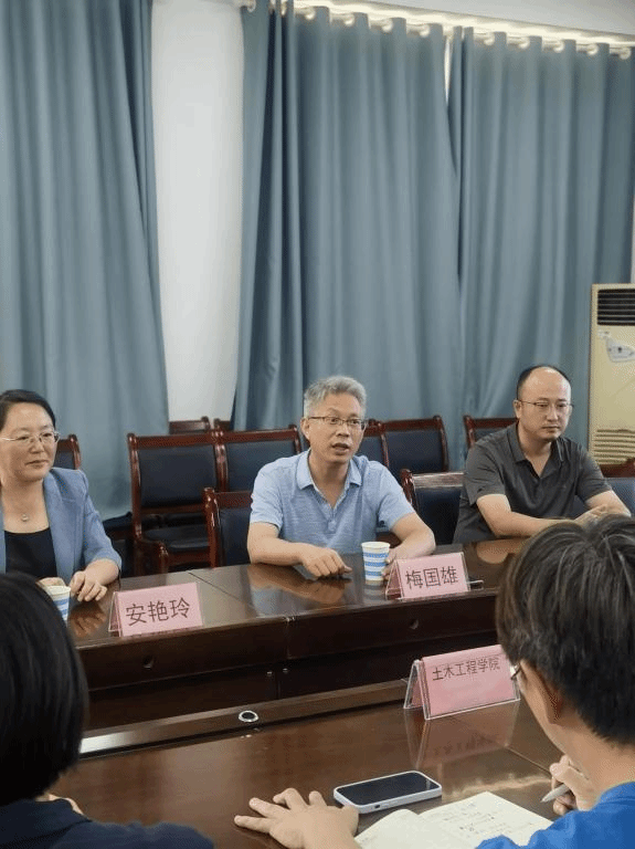 本网讯(土木工程学院 图文/卢云)7月21日下午,浙江大学梅国雄教授莅临我院指导交流。贵州理工学院副院长安艳玲出席,贵州大学饶军应副教授、刘宁副教授、我校建筑与城市规划学院刘建浩副教授、土木工程学院的相关学科教师参加座谈交流,会议由土木工程学院院长贺明卫主持。