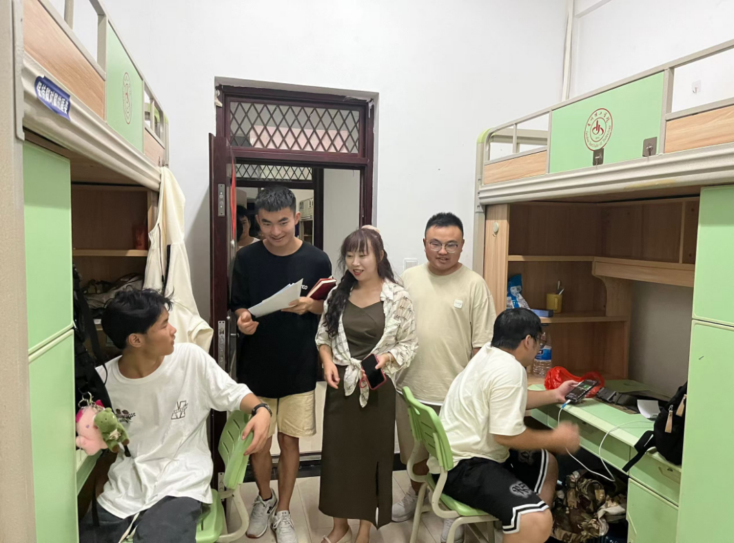 新生报到当日,学院2024级新生辅导员熊雪梅、新生班主任及和学院团学各部门负责人,前往新生宿舍区慰问新生,老师们亲切地询问了同学们的生活情况,关心他们的住宿条件,并提醒大家要注意个人财物安全和个人卫生,以及强调军训注意事项。此外,老师们还鼓励新生要尽快适应大学生活,积极参加校园文化活动,加强同学间的沟通交流,共同营造一个温馨和谐的宿舍环境。