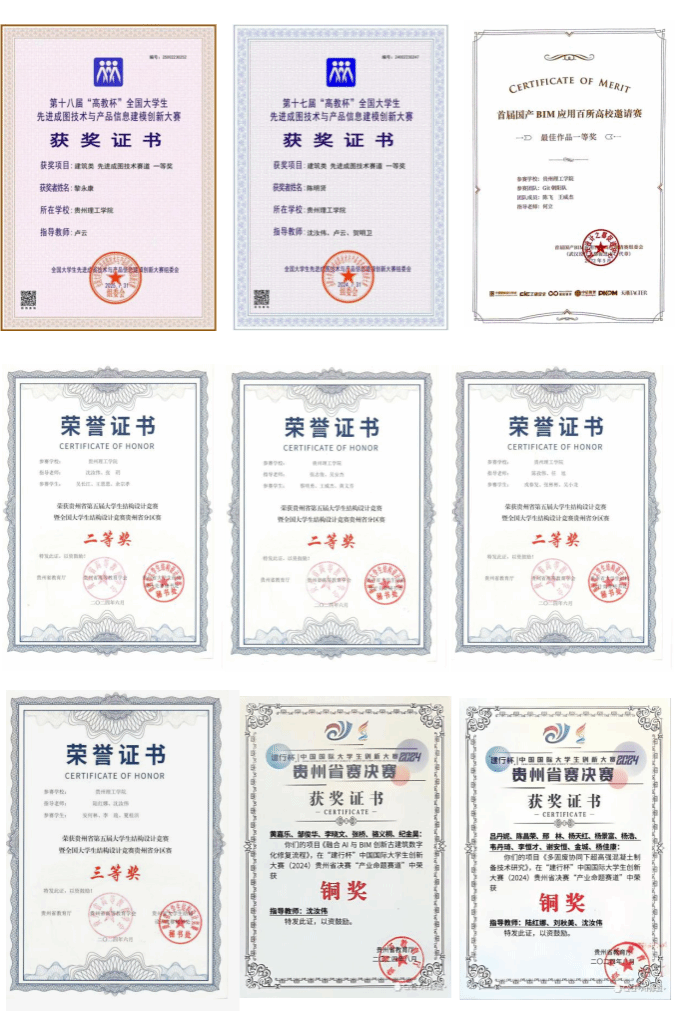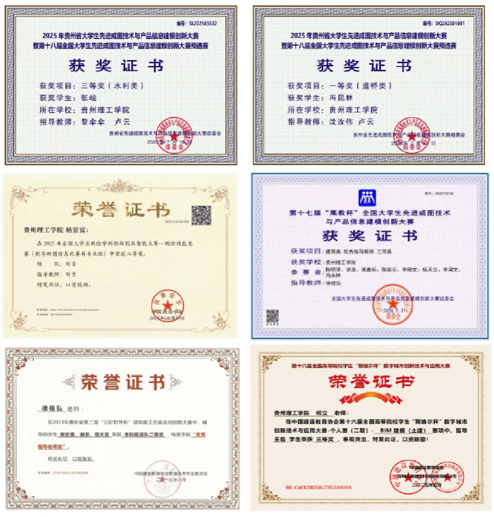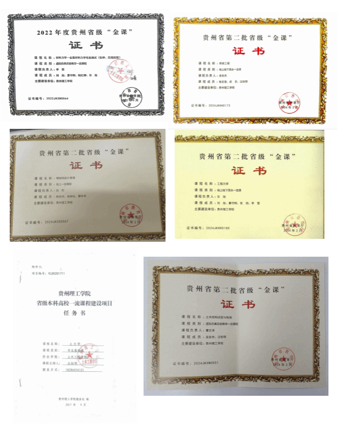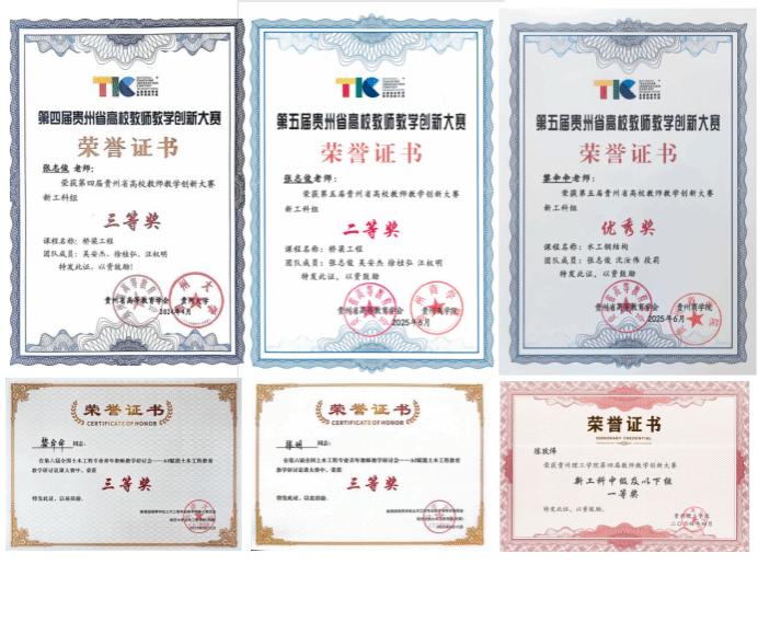 深化产教协同育人。学院重视学生实践能力、创新能力和协作能力培养,通过强化校企合作共建协同创新育人基地、提升实践技能、提高毕业设计质量和构建实践教学体系等方式强化实践教学,构建“基础实验-综合实训-学科竞赛-双创项目”四阶递进实践体系,毕业设计选题均来源于生产实践或工程设计。学院以“土木水利”专硕点培育建设为抓手,与企业联合申报获批了“土木工程贵州省科技创新领军人才工作站”“贵州省土木工程健康监测与智能防灾工程研究中心”和“贵州省轨道交通基础设施运维及数字孪生应用科技创新人才团队”;先后承担国家级科研项目14项,省部级科研项目26项,横向科研项目40余项,经费累计近两千万元;在国内外刊物发表论文200余篇,获专利50余项;出版专著、教材20余部;科技转化成果1项,参编地方标准10余项;获得贵州省科技进步奖三等奖2项、贵州省自然科学三等奖2项、贵州省青年科技奖1项。