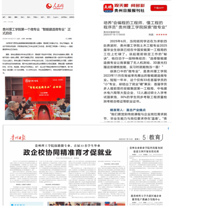 校企合作创设微专业。为增强学生对建筑业工业化、数字化、智能化和绿色化协同发展新需求的适应性,学院坚持守“土木”传统之“正”、创“土木”发展之“新”,依托与中建科技等龙头企业共建的智能建造产业学院,2023年开设了全省高校土建类首个微专业——“智能建造”微专业,构建“BIM技术+智能施工+建筑工业化”课程模块,开发《人工智能导论》等9门校企合作课程(企业导师授课占比达50%以上)。目前,首届智能建造微专业学生已毕业,喜获用人单位好评。2025年学院联合企业又新增设“智慧测量与低空监测”“结构健康智能诊治”“钢结构智能设计与装配”“智能施工安全管控”“数智融合项目决策与管理”等5个微专业。
