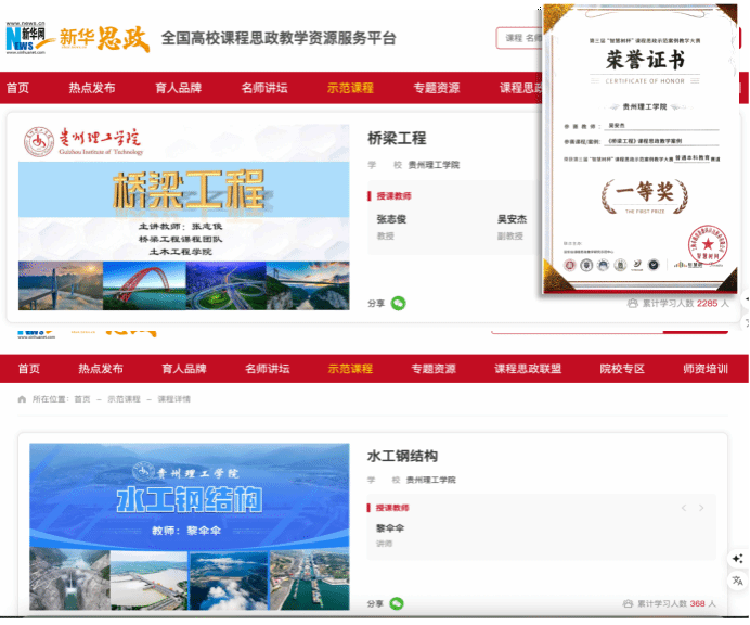 深化课程思政建设。学院注重引导教师弘扬教育家精神,当好“经师”与“人师”,与马克思主义学院“结对子”联合开展集体备课,有效提升教师课程思政意识和能力。近三年来,3人次获校级“课程思政”教学竞赛奖项,《桥梁工程》课程团队获“智慧树”杯课程思政示范案例教学大赛一等奖;《桥梁工程》《水工钢结构》《钢结构设计原理》《混凝土结构设计原理》《高层建筑结构与抗震》《土力学》《材料力学》《工程力学》《水电站建筑物》《装配式混凝土建筑》等10门课程被认定为校级“课程思政”示范课程,其中,《桥梁工程》和《水工钢结构》课程在新华网“新华思政—全国高校课程思政教学资源服务”平台上线;获立项校级课程思政及相关教改研究项目8项;土木工程、道路桥梁与渡河工程专业被认定为校级课程思政示范专业,实现课程思政建设从“点上突破”到“面上覆盖”的跨越式发展。