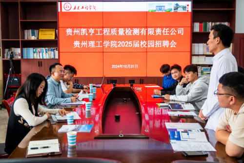 本网讯(土木工程学院 图文/土木工程学院)10月31日,贵州凯亨工程质量检测有限责任公司在学校敏行楼3547会议室成功举办了2025届校园招聘会。土木工程学院院长贺明卫、卢云老师盛情接待,部分2025届毕业生参加。