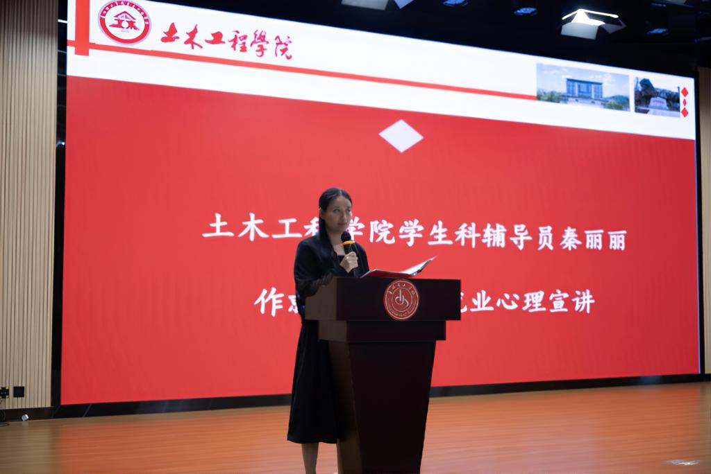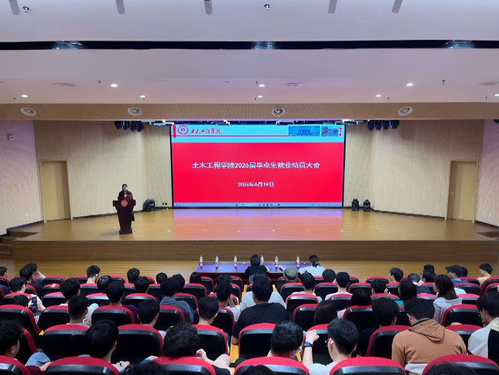 本网讯(土木工程学院 文/王鹤凯 图/刘旭 王鹤凯)6月20日下午,土木工程学院于蕴华楼小礼堂召开2026届毕业生就业动员大会。会议通过经验分享、政策解读、心理疏导等环节,为大家“解疑惑、指方向、强信心”。学院党总支副书记杨文斯、全体辅导员及2026届320名学生参会,大会由辅导员秦丽丽主持。