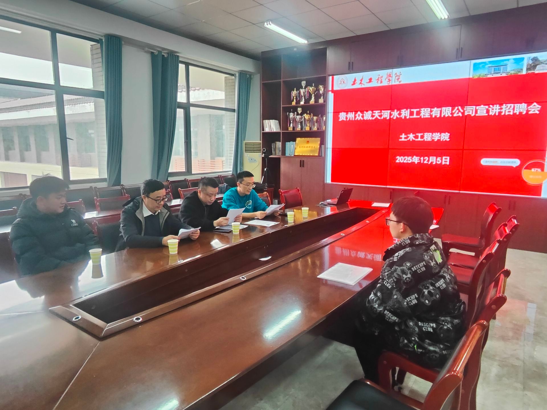 本网讯(土木工程学院 图/杨顺风 文/潘柳玉)12月5日下午,贵州众诚天河水利工程有限公司专场招聘会在敏行楼3547会议室顺利举办。土木工程学院党总支副书记杨文斯、学生科副科长秦丽丽、教师程国锋及2026届水利水电工程专业学生参加。