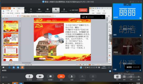 本网讯 (图/蒋佳桐 文/蒋佳桐)时光流逝,如白驹过隙。不知不觉毕业季悄悄来临,毕业季的骊歌悄然响起,不述离伤,只言珍重,为切实发挥好我支部毕业生党员在毕业离校工作中发挥党员先锋模范带头作用,2020年7月1日上午10点,土木工程学院学生党支部全体党员在钉钉直播平台开展以“庆祝建党99周年”为题的主题党日活动,旨在重温入党誓词,坚定理想信念,欢送2020届毕业生党员,活动由土木学院学生党支部书记秦丽丽主持。