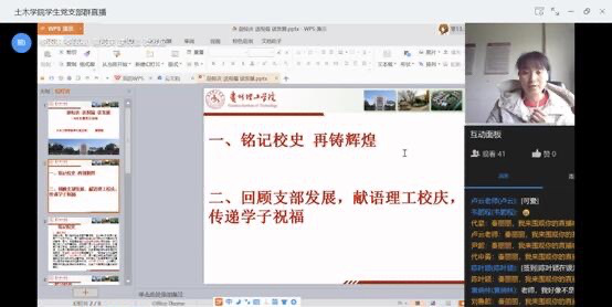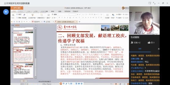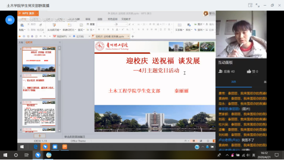 本网讯(土木工程学院 文/袁晓林 图/袁晓林)在此春夏交接之际,贵州理工学院迎来了第七岁的生日。为喜迎贵州理工学院七年华诞,土木工程学院学生党支部书记秦丽丽老师于2020年4月21日13:00利用钉钉网络直播平台开展了“迎校庆,送祝福,谈发展”主题党日活动,全体党员参加此次活动。