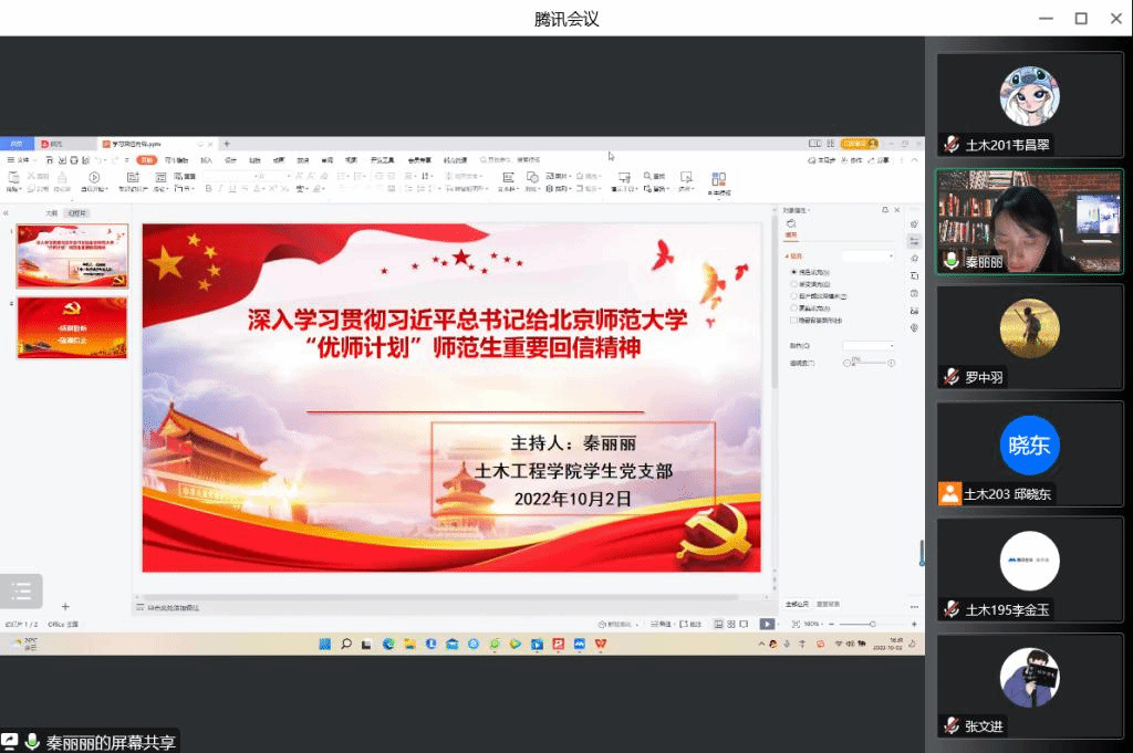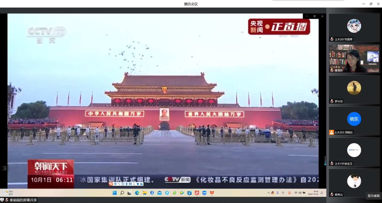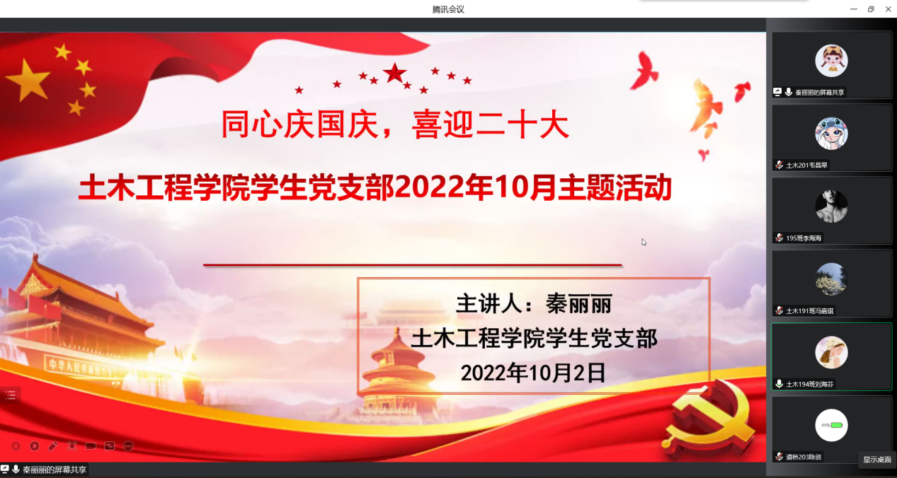 (本网讯 土木工程学院 图文/韦昌翠)10月2日,土木工程学院学生党支部于腾讯会议开展线上“同心庆国庆,喜迎二十大”主题活动。本次主题活动由我院学生党支部书记秦丽丽主持,支部全体党员参加。