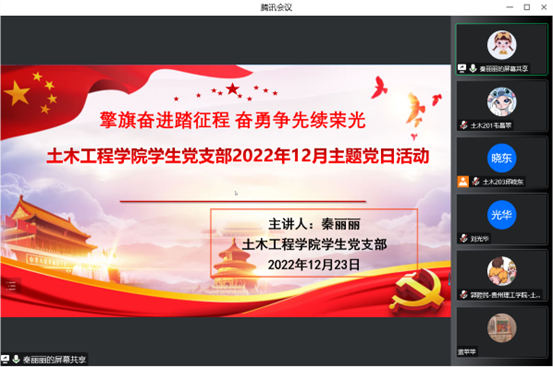 (本网讯 土木工程学院 图文/韦昌翠)12月23日,土木工程学院学生党支部于腾讯会议线上开展“擎旗奋进踏征程 奋勇争先续荣光”主题活动。本次主题活动由我院学生党支部书记秦丽丽主持,支部全体党员参加。