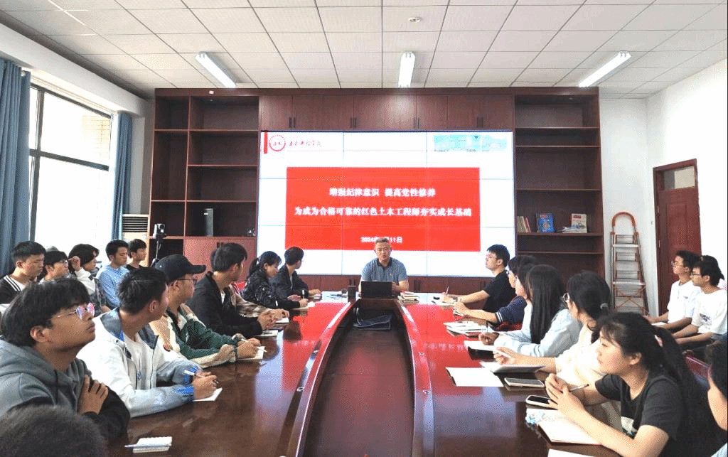 本网讯 (土木工程学院 图文/韦昌翠)5月11日,学院党总支书记彭勇以“增强纪律意识,提高党性修养,为成为合格可靠的红色土木工程师夯实成长基础”为题,在敏行楼3547室给学生党支部全体党员、发展对象上党纪学习教育专题党课。