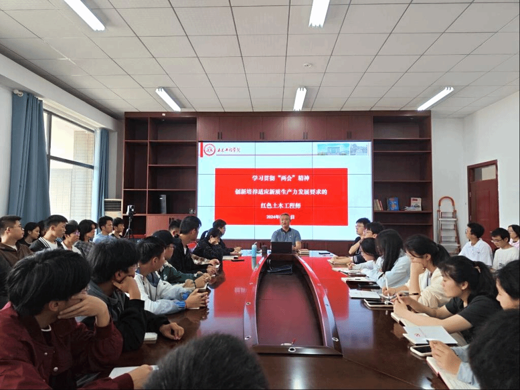 彭勇详细介绍了今年两会高频词“新质生产力”的提出过程、科学内涵与实践意义,引导同学从政府工作报告中一组组数据解读过去一年全面建设社会主义现代化国家迈出坚实步伐,深刻理解“发展新质生产力是推动高质量发展的内在要求和重要着力点”。结合学院“智能建造”微专业建设、产业学院建设和工程教育专业认证工作等发展实际, 介绍了学院按照“强责任、精技术、善管理、重实践、求创新”要求,培养具有鲜红政治底色、扎实工学基础、较好数字化素养和创新能力的新时代红色工程师的措施办法。