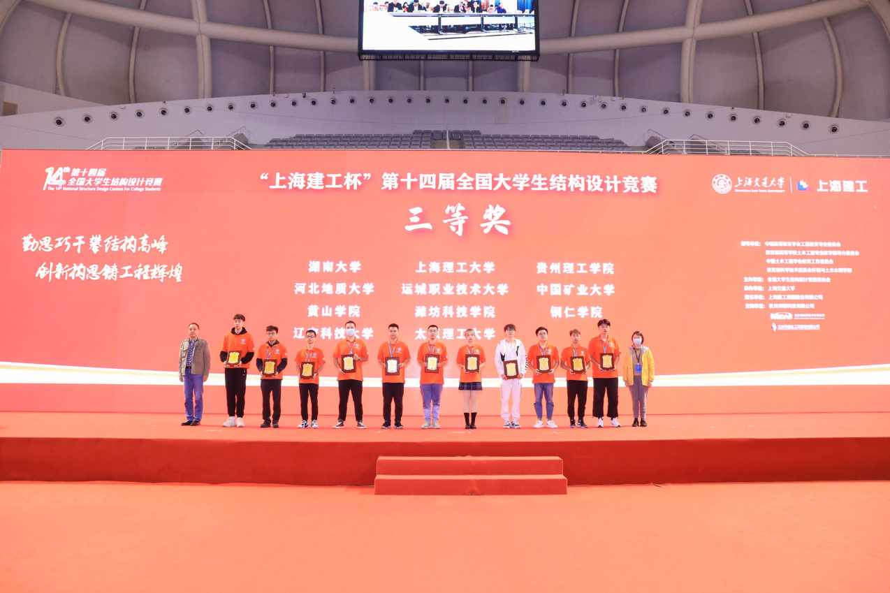 本网讯(土木工程学院 文\沈汝伟 图片\沈汝伟)2021年10月17日,为期4天的第十四届全国大学生结构设计竞赛在上海交通大学落下帷幕。贵州理工学院代表队(参赛学生:周毅、龙金成、陈锐,指导教师:沈汝伟)荣获三等奖,同时贵州理工学院获优秀组织奖。