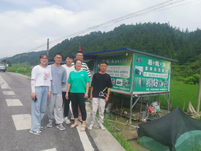 在村民的带领下,队伍参观了当地的养殖基地,了解其养殖模式,并结合地理因素和传统产业优势,协同村民打造“稻+蛙+鱼套养示范基地”。