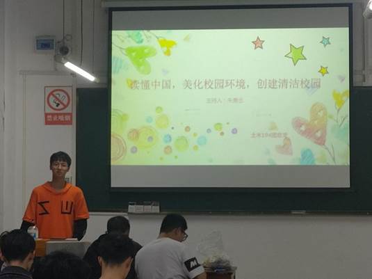 本网讯(土木工程学院 文/吴桓 图/叶凡)为让同学们了解校园环保的重要性,呼吁同学们爱好爱护环境卫生,建设美好校园,养成环保习惯,2021年3月17日晚,土木工程学院土木194班开展“读懂中国,美化校园环境,创建清洁校园”主题团日活动。本次活动由土木194班团支书朱勇念同学主持,194班全体同学参与。