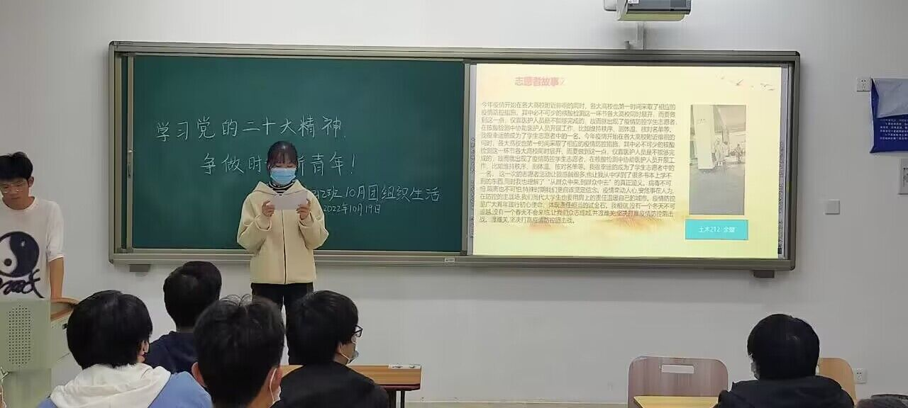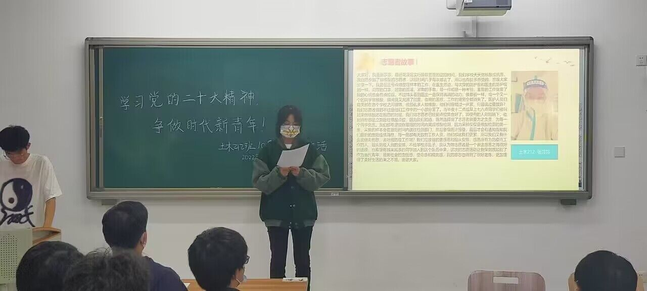 随后,杨天红和李欣荣上台依次分享了学习党的二十大精神的心得体会。张莎莎、余蝶上台分享了参加志愿者的经验与感受,号召班级同学积极投身于志愿活动中,为同学服务。