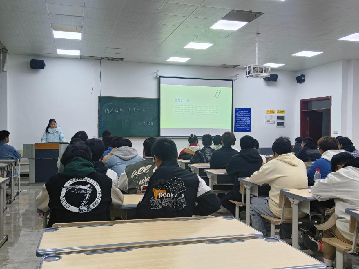 本网讯(土木工程学院 图/胡文明 文/田海霞)为加强同学们的国防意识,普及国防安全的重要性。土木231班于11月13日在敏行楼G3324开展了“情系国防,青年当先”主题团日活动。本次活动由土木231班团支书陈冬萱主持,土木234班退伍学生周权威、道桥202班退伍学生黎大雄主讲。土木231班全体同学参加。