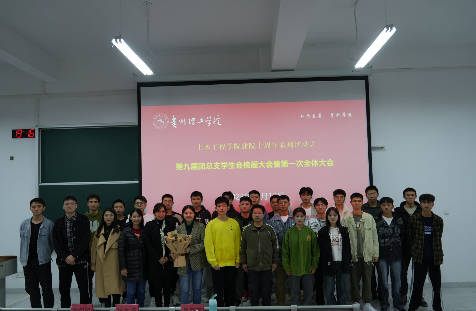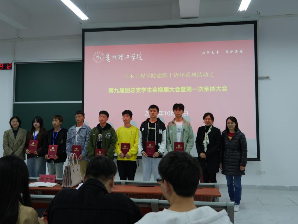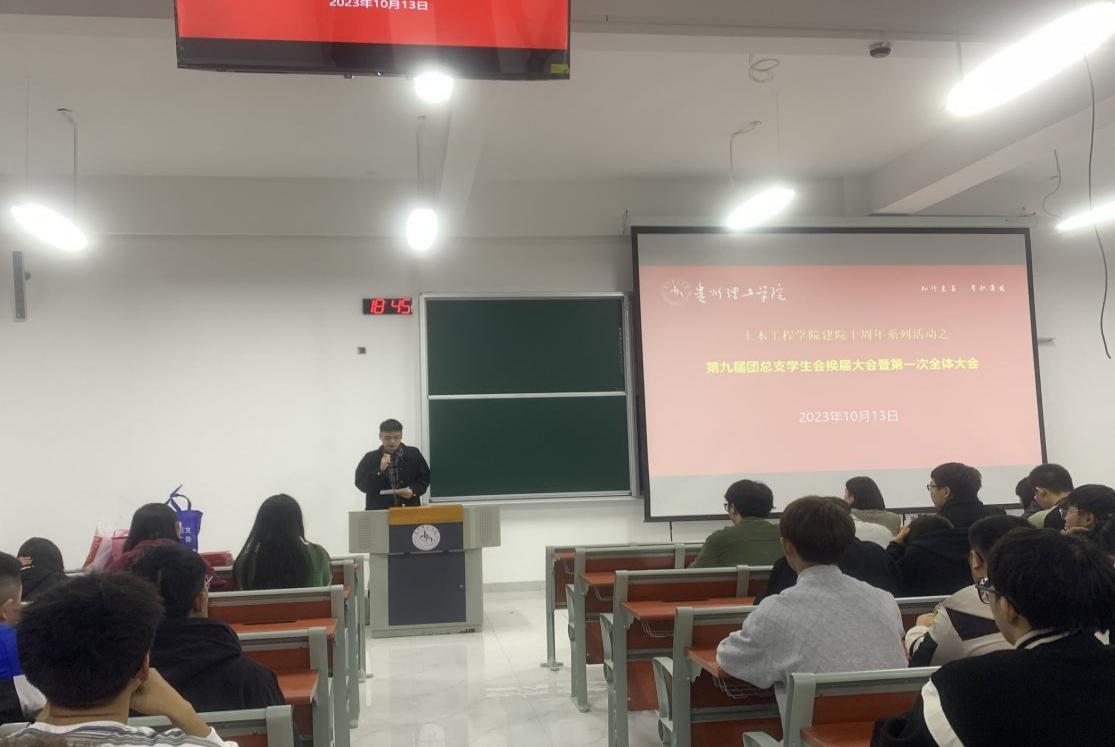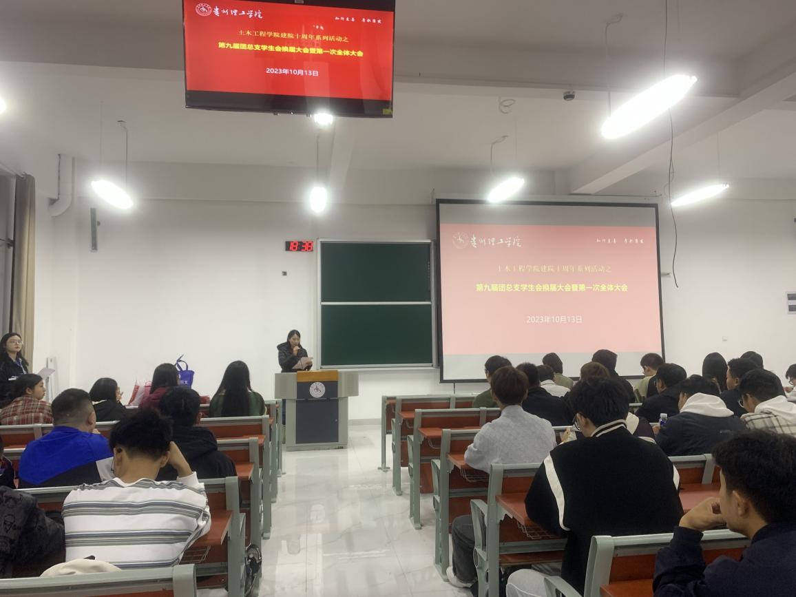 本网讯(图/潘柳玉 文/王鹤凯)2023年10月13日晚,土木工程学院第九届团总支学生会换届大会暨第一次全体大会在C01-126教室举行,土木工程学院党总支副书记杨文斯、辅导员李昀璐、秦丽丽出席本次会议,团总支与学生会成员参会,会议由学生会主席黄义芳主持。