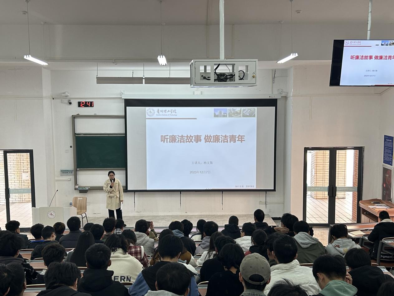 杨文斯通过分享“中国铁路之父”——詹天佑的廉洁故事,引导大家要向前辈看齐,保持廉洁的品质,同时指出当前学生中存在的不廉洁现象,引导大家要树立正确的廉洁观、坚定理想信念,形成求真务实的学习作风,养成勤俭节约的生活作风。