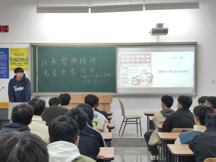 本网讯(土木工程学院 图文/盛继匀)为弘扬雷锋精神,传递社会正能量,彰显时代担当。3月11日晚,水电231班在G1117举行主题为“传承雷锋精神,彰显青春担当”的团组织生活。本次团组织生活由彭成财主持,2021级学长姜发杨及水电231班全体同学参与。