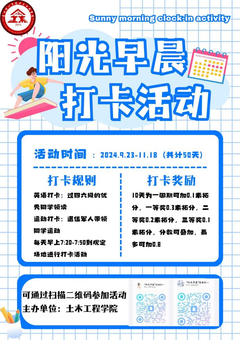 本网讯(土木工程学院 图文/土木工程学院)一年之计在于春,一日之计在于晨。新的一天总是充满着无限可能,土木工程学院举办的“阳光早晨”打卡活动第四期即将开始啦!我们又可以相约在这个充满希望的校园里,一同迎接第一缕阳光,遇见每天的美好!