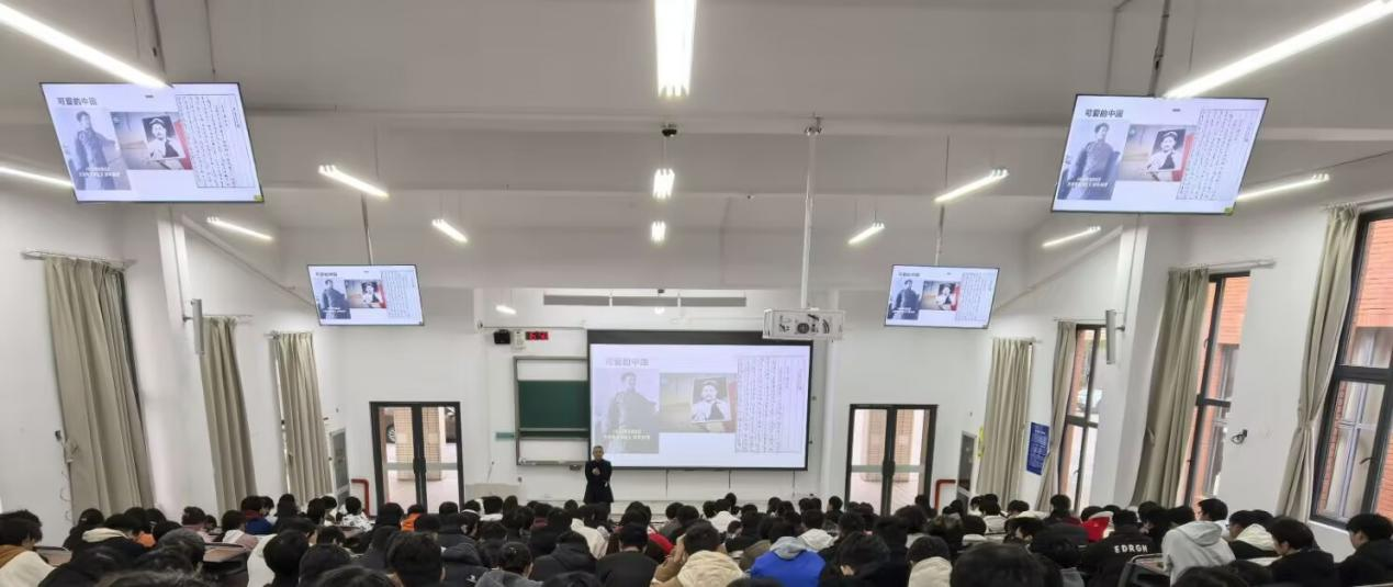 接着,他以“一代人有一代人的使命,一代人有一代人的担当”,讲述革命先辈陈望道翻译《共产党宣言》和方志敏在狱中写《可爱的中国》的故事,以及雷锋的故事,钱学森回国报效祖国和南仁东建设大国重器的故事,还有张桂梅、黄大发、黄文秀、余留芬、杨波以及杜富国、陈祥榕的故事,让同学们从革命、建设和改革开放以及新时代先进人物的奋斗故事中,感受信仰的力量、奋进的力量、人民的力量。体悟幸福生活来之不易,幸福都是奋斗出来的道理。