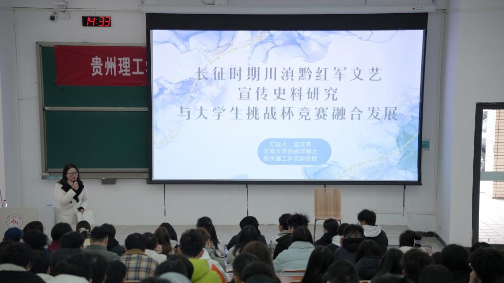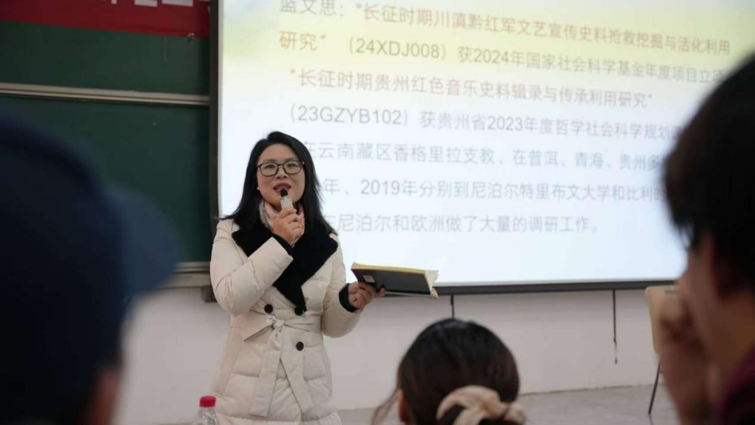 蓝老师聚焦“长征时期川滇黔红军文艺宣传史料研究”,通过详实史料与调研图片、视频,展示了她带领团队开展相关调查研究的过程,还原了红军在川滇黔地区利用文艺宣传凝聚力量、鼓舞士气的历史场景,让在场师生对长征历史有更全面深刻的认识。