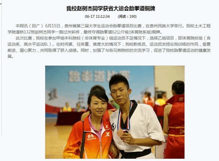 工作上,赵树杰在校期间曾担任道桥132班团支书、贵州理工学院青年志愿者协会部长、跆拳道社团社长兼跆拳道校队队长。担任班级团支书期间曾带领班级荣获校级“优秀共青团支部”称号;担任跆拳道社团社长期间曾带领社团荣获校级“优秀社团”和“五星级社团”等称号。