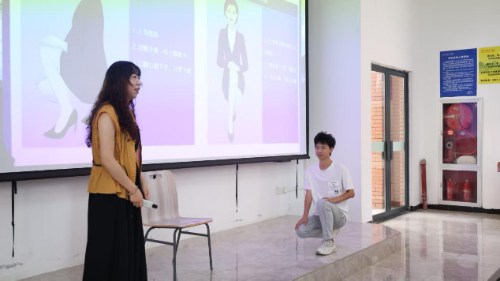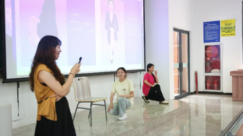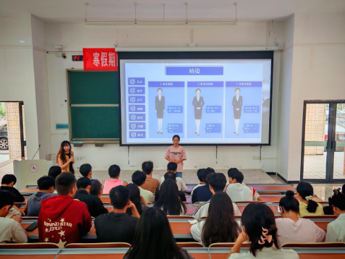 熊雪梅以理论讲解结合情景模拟的形式展开,围绕学生干部日常工作场景,重点解读了仪容仪表规范和沟通交流礼仪两大核心模块。现场通过互动演示、分组演练等环节,让学员们直观掌握站姿坐姿、握手递物等细节要点,深刻理解“以礼待人、以仪服人”在工作协作中的重要性 。