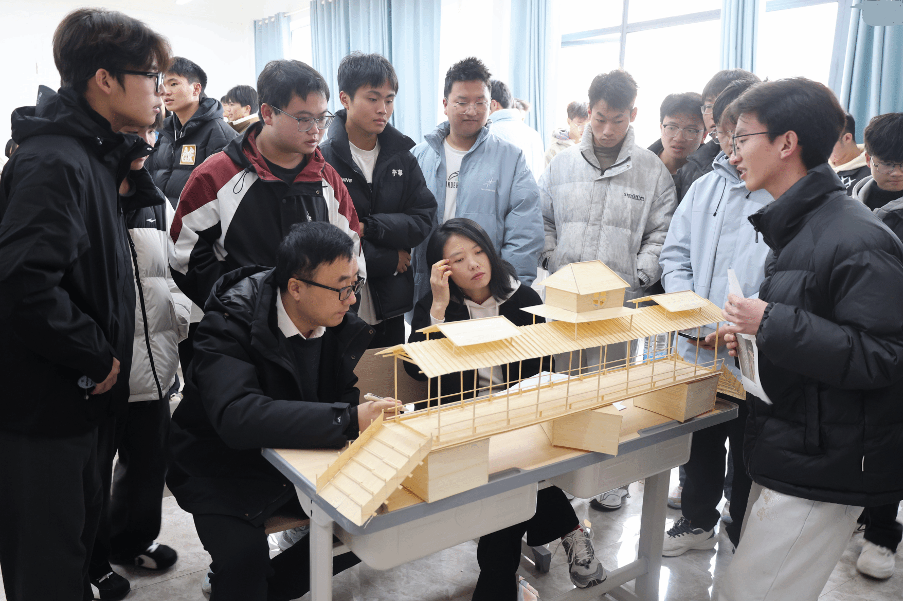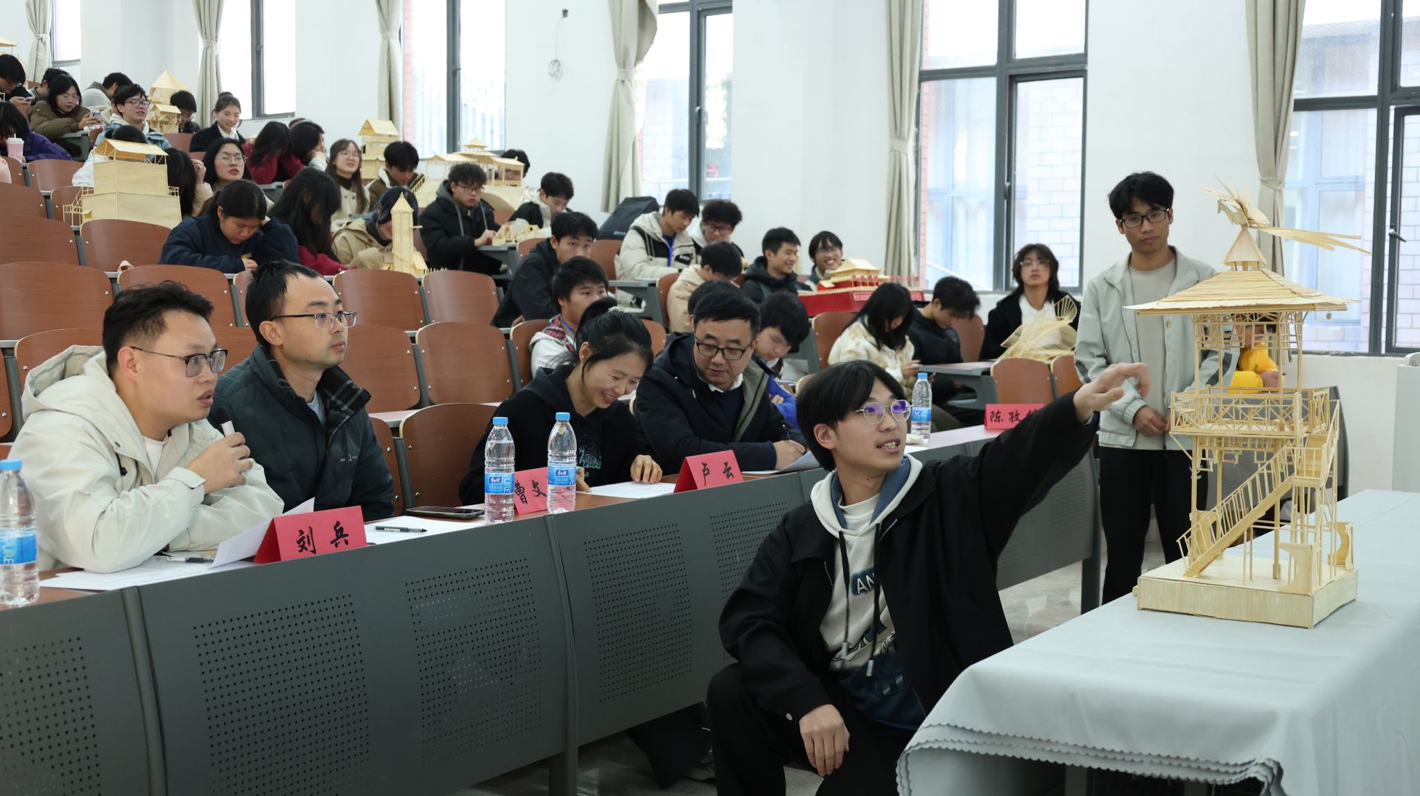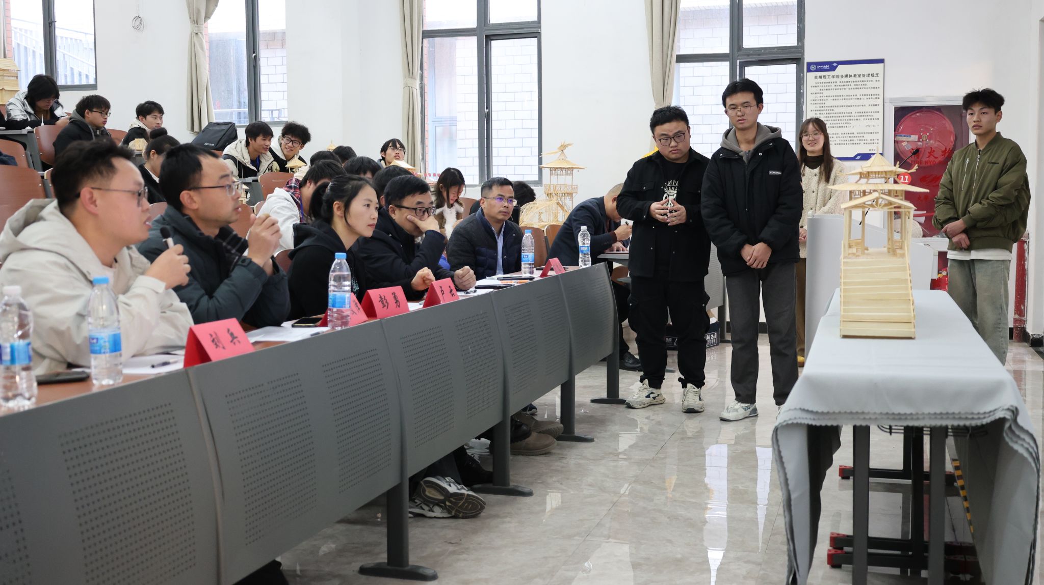 本届大赛初赛于11月20日在敏行楼G3320进行,来自土木工程学院、建筑与城市规划学院、材料与能源工程学院、人工智能与电气工程学院等多个学院的125组作品亮相初赛。参赛小组依次向评委阐述模型的创意理念、制作工艺和设计亮点。评委从模型创意独特性、力学结构稳定性、空间设计创新性以及机理科学性等维度进行点评打分,并给出具有针对性的改进建议。最终,23组作品脱颖而出,成功晋级决赛。
