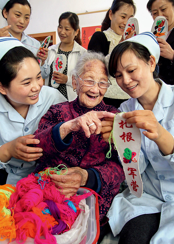 近年来,山东坚持传承红色基因,将“弘扬沂蒙精神、坚定理想信念”作为铸魂育人的重要主题。104岁老党员张淑贞是沂蒙革命老区最高龄的“沂蒙红嫂”。在抗战时期,她跟随婆婆王换于一起为八路军做军鞋、筹军粮,并创办了地下托儿所,抚养了一大批革命后代。图为张淑贞同沂南县人民医院的医护人员一起做鞋垫。 杜昱葆/摄