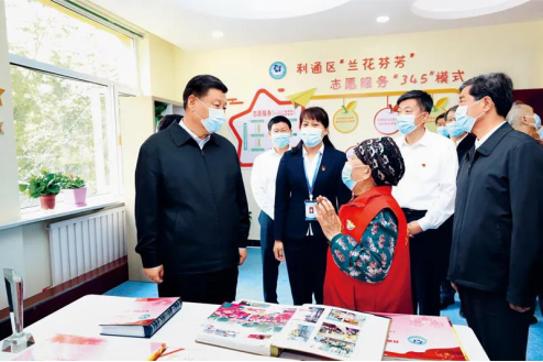 2020年6月8日至10日,中共中央总书记、国家主席、中央军委主席习近平在宁夏考察。这是6月8日下午,习近平在吴忠市利通区金花园社区党群活动服务中心,同社区志愿者代表亲切交谈。 新华社记者 鞠鹏/摄