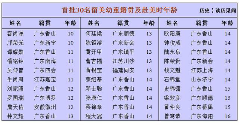 1872年首批30名留美幼童籍贯及赴美时年龄