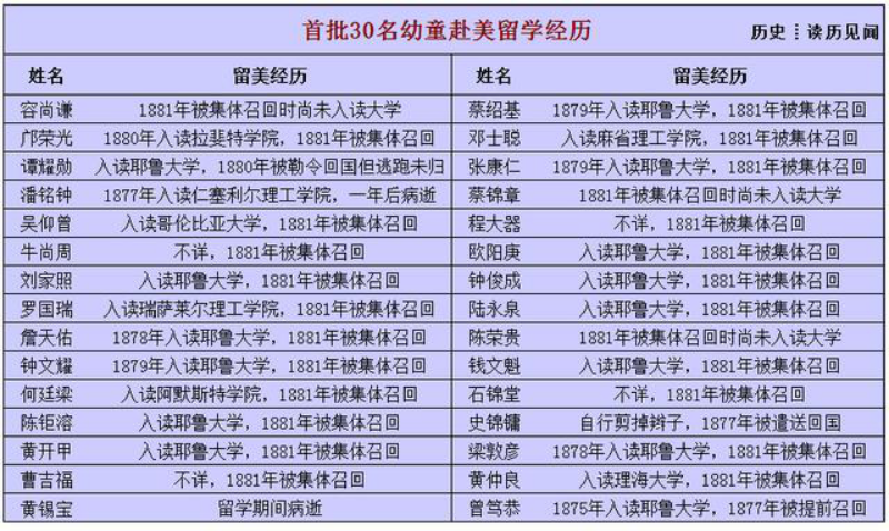而与此同时,最年长的曾笃恭在入读耶鲁大学两年后被提前召回。史锦镛则因为自行剪掉了辫子,被出洋肄业局认为“习化过于严重”而在1877年被遣送回国。入读耶鲁大学的谭耀勋则因为私自加入基督教会而被勒令回国,不过他在遣返途中跳车逃走未归,但他在1883年毕业后不幸病逝,葬在了康涅狄格州的库布鲁克镇。