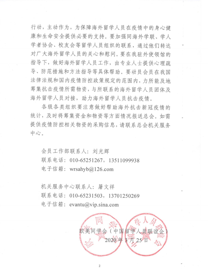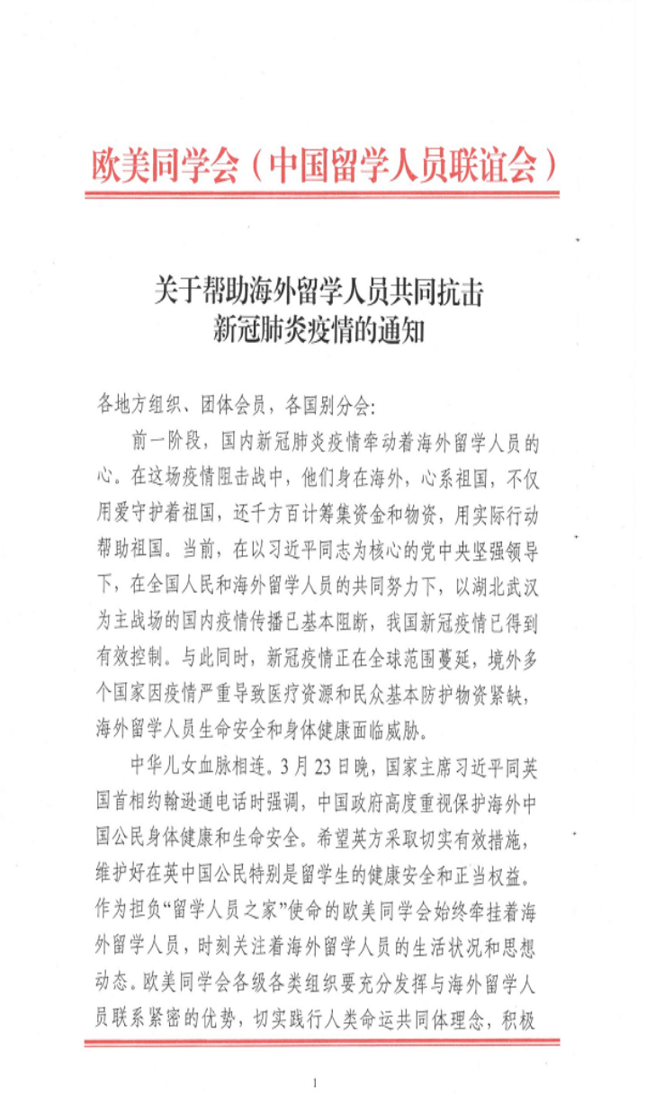 关于转发欧美同学会《关于帮助海外留学人员共同抗击新冠肺炎疫情的通知》的通知