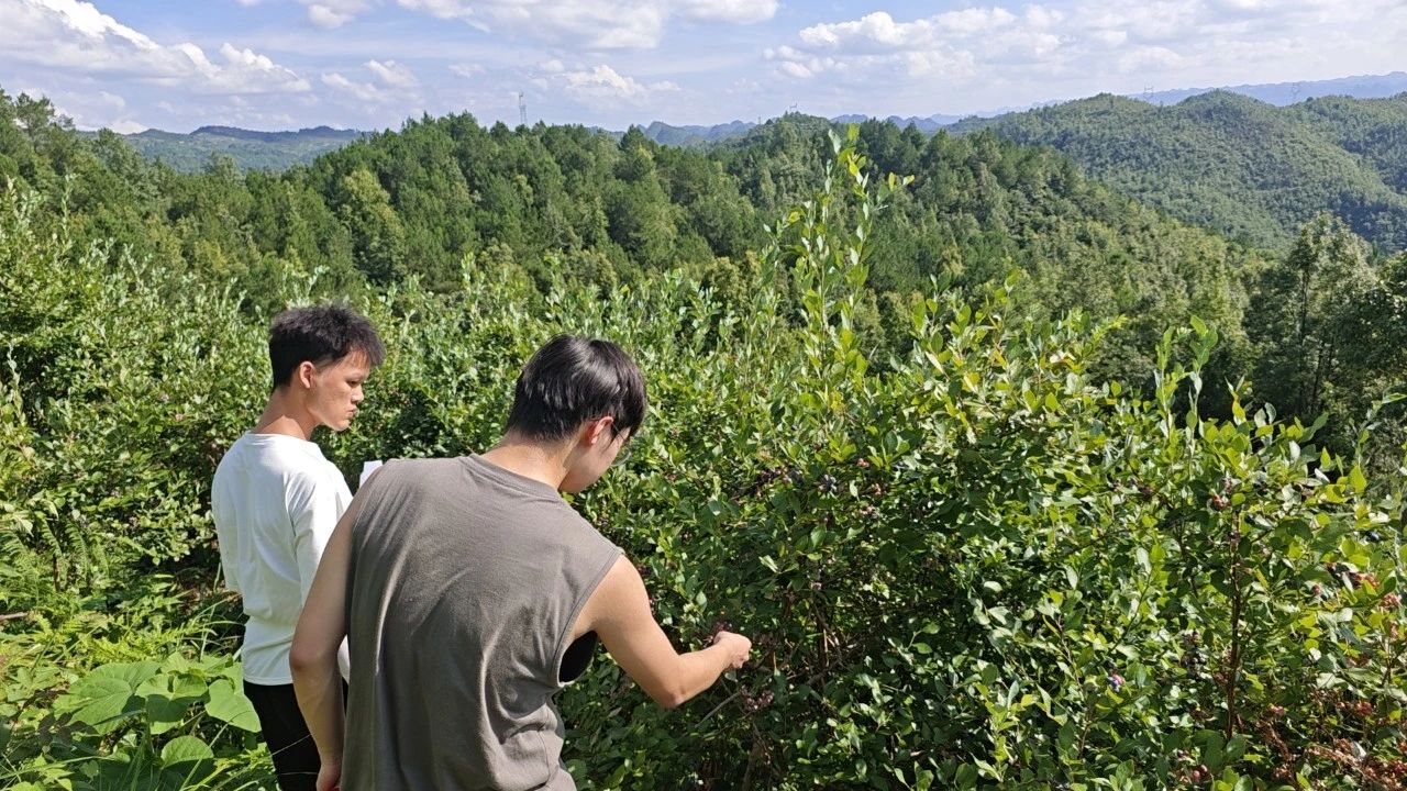 7月10日,实践队员在平塘县团县委副书记、亮寨村驻村第一书记陈冠希、卡蒲毛南族乡党委委员、副乡长李自飞等同志的带领下来到卡蒲毛南族乡亮寨村蓝莓园调研当地蓝莓产业的种植发展情况