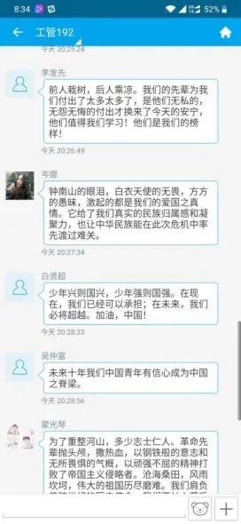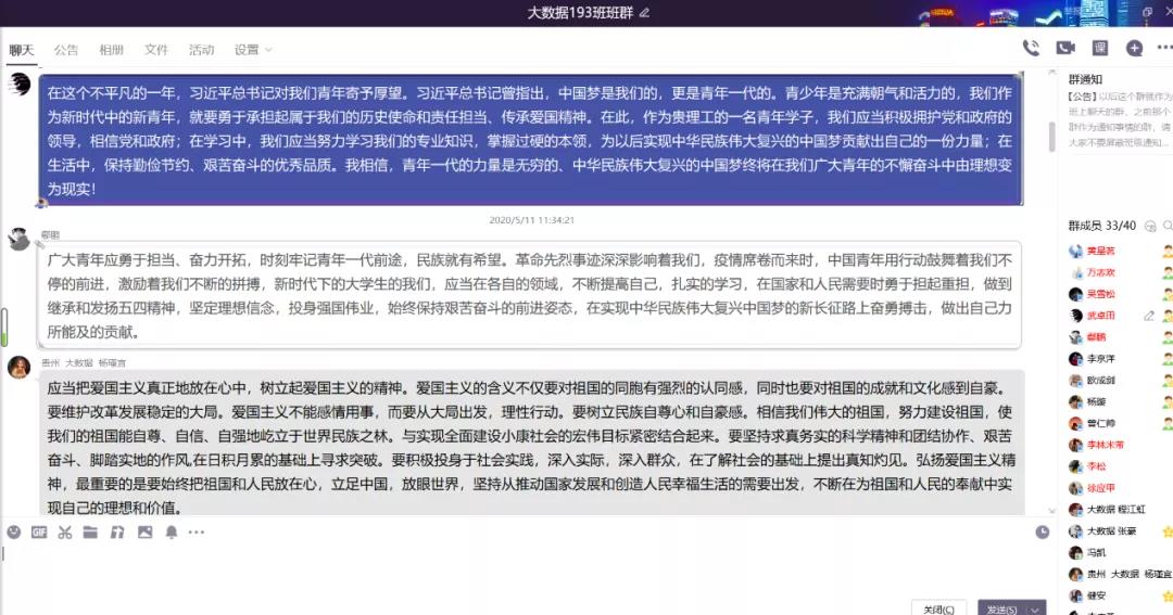 3.工管192团支部于2020年5月10日晚上,在班群QQ课堂上集结全班开展此次会议。同学们在观看爱国电影《横空出世》时,感受到先辈们为了中国崛起而舍生忘死的精神!并讨论了作为新青年,我们应该为国家,为社会做出什么贡献。开展了论文征集,和爱国视频征集活动,让同学们一起为祖国打call,牢记青春使命,奋勇向前,用奋斗书写未来画卷