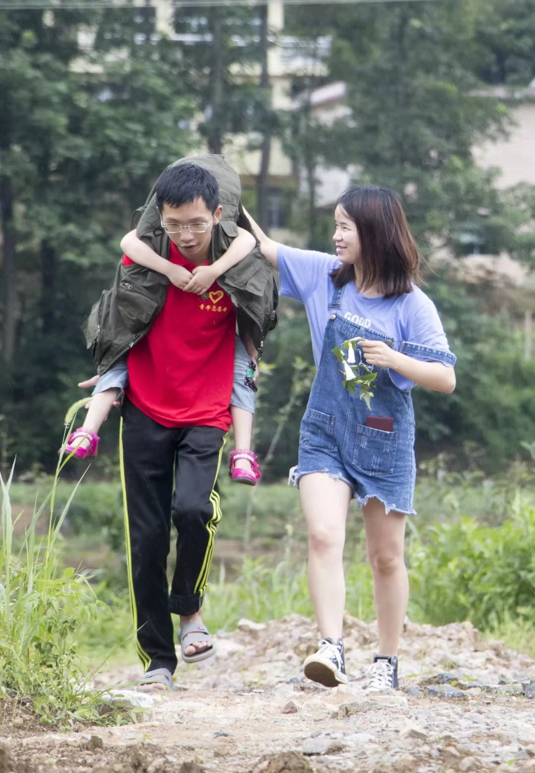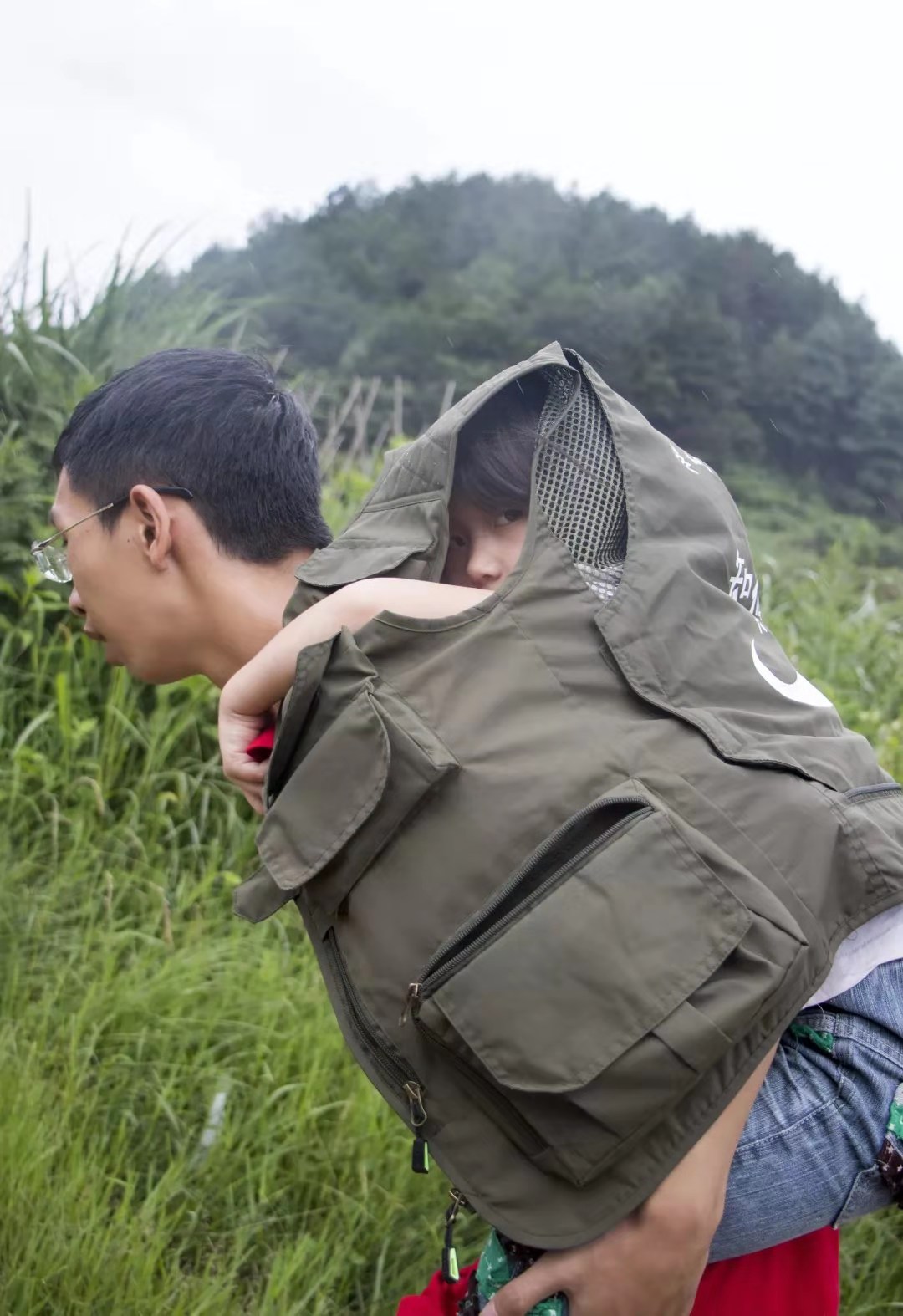 散步的路上,下雨了,脱下队服穿在小朋友身上,背起回学校