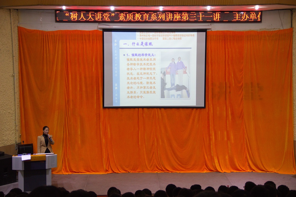 2014年11月5日,贵州理工学院“树人大讲堂”素质教育系列讲座第三十一讲在逸夫小报告厅开讲。中国经络催眠治疗师、国家二级心理咨询师、贵州地区唯一授权可培训并颁发NGH催眠师资格证的导师、贵阳中医学院心理学副教授周振华为我校师生作了题为“催眠秀”的讲座。