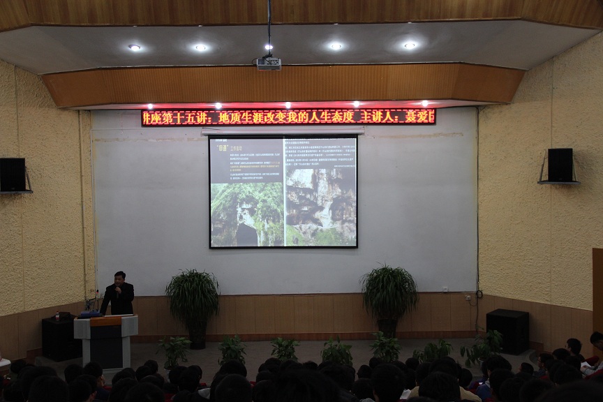3月12号晚,贵州理工学院“树人大讲堂”素质教育系列讲座第十五讲在逸夫小报告厅举行,我校资源与环境工程学院院长聂爱国教授为350名同学做了题为“地质生涯改变我的人生态度”的讲座。