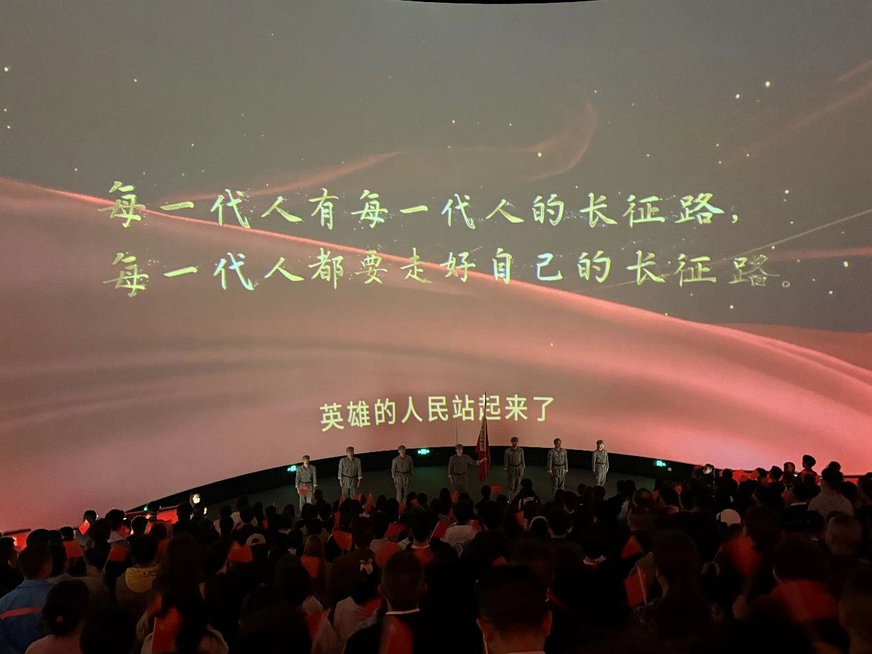 “红飘带”长征数字科技艺术馆是全国首个以长征为主题的全域沉浸式数字科技体验馆。在《红飘带·伟大征程》篇中,同学们沉浸式体验,通过聆听“无名英雄”“血火洗礼”“伟大转折”“砥砺征途”等六个篇章的故事,感受长征过程中“遵义会议”“四渡赤水”等重要历史事件和场景,以历史结合科技的方式,让同学们置身于长征的历史场景中,切身感受红军战士们的英勇无畏和坚定信念。接着在《红飘带·多彩飞越》中,同学们通过巨LED球幕飞行影院,身临其境地领略了贵州壮美的自然风光,感受到了科技与艺术的完美结合。