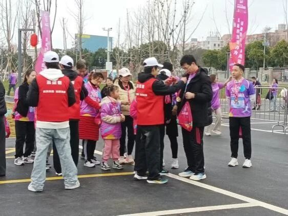 赛事当天,志愿者们分工协作、高效联动,全力保障赛事顺畅运行。赛道指引组人员驻守起终点及沿线关键点位,为选手清晰指引方向、及时解答疑问,确保全程畅通;物资补给组人员提前清点、搬运并摆放补给,赛中及时为选手补充能量,筑牢补给保障线;奖牌发放组人员在终点区域热情等候完赛选手,有序颁发奖牌与完赛物资,主动提供贴心协助与关怀。全体志愿者以热情专业的服务,保障了赛事各环节顺利推进。